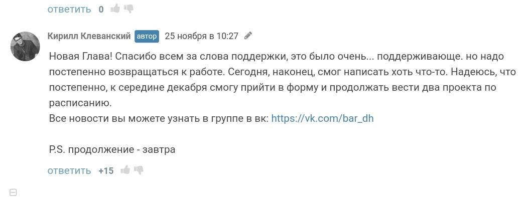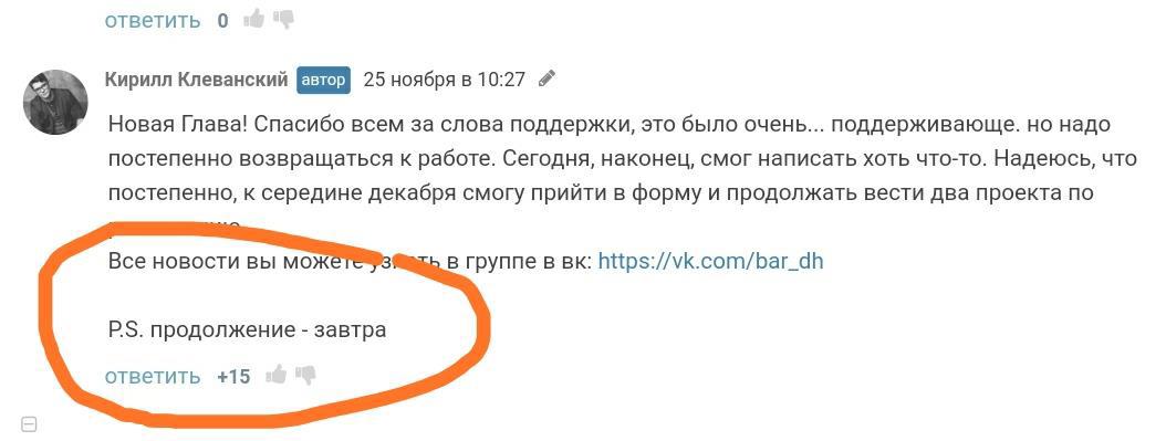 Ну если у вас пару дней равно пяти, то да. И не факт, что завтра будет. А каждый день в группе завтраками кормит народ. То праздник неожиданно, то ноутбук в ремонт перед выкладкой глав, то нестыковка в сюжете. Я всё понимаю, но скажи ты прямо "когда напишу не знаю". Зачем раздражать ожидающих пустыми обещаниями публикации?