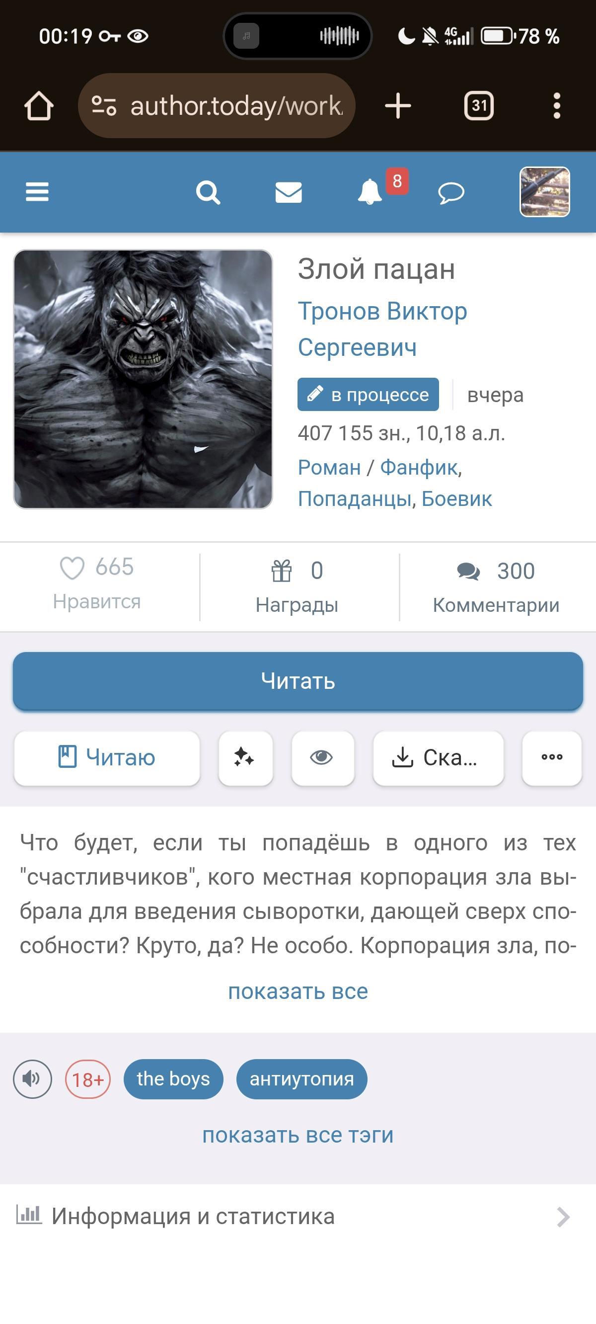 Да, но автор уже начинает высасывать сюжет из пальца и пишет крайне редко, я бы на его месте том адекватно закончил и ждал бы контент для фанфика или же комикс прочитал и пилил по нему, ну или столкнулся ГГ с каким то телепортером, отправмагего героя в сермальную версию Пацанов, чтобы толкнуть лбами двух Хоумлендеров. Все лучше, чем выходит сейчас увы:(