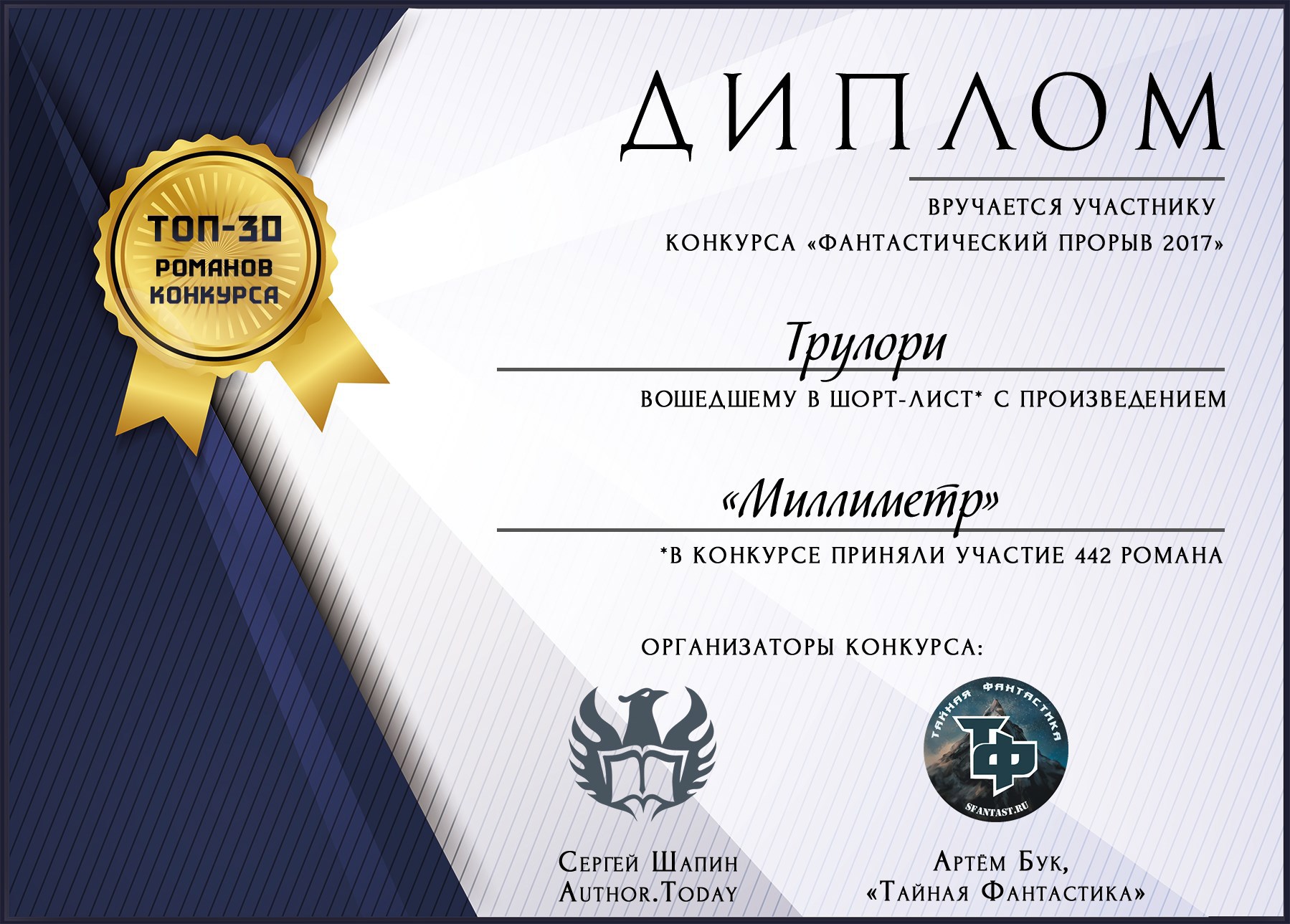 Выдается всем участникам конкурса романов «Фантастический прорыв 2017»