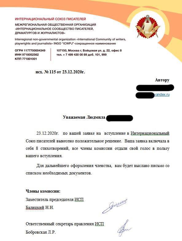 Давайте сначала отвечу на первый вопрос. Мы вашу кандидатуру не рассматривали, именно в нашей почте ваших писем нет. Вы попали на полностью отзеркаленный мошенниками сайт. Сайт был создан специально для того, чтобы собирать деньги с доверчивых писателей за якобы вступление в союз. К сожалению, таких людей оказалось много. Мы до сих пор разбираемся с пострадавшими. Сайт давно прикрыли правоохранители, заведено уголовное дело по статье "Мошенничество", пытаются найти организаторов. Мы, к сожалению, не разбираемся в тех вопросах, и не можем сказать, как подделали адрес почты, но теперь знаем, что это возможно.