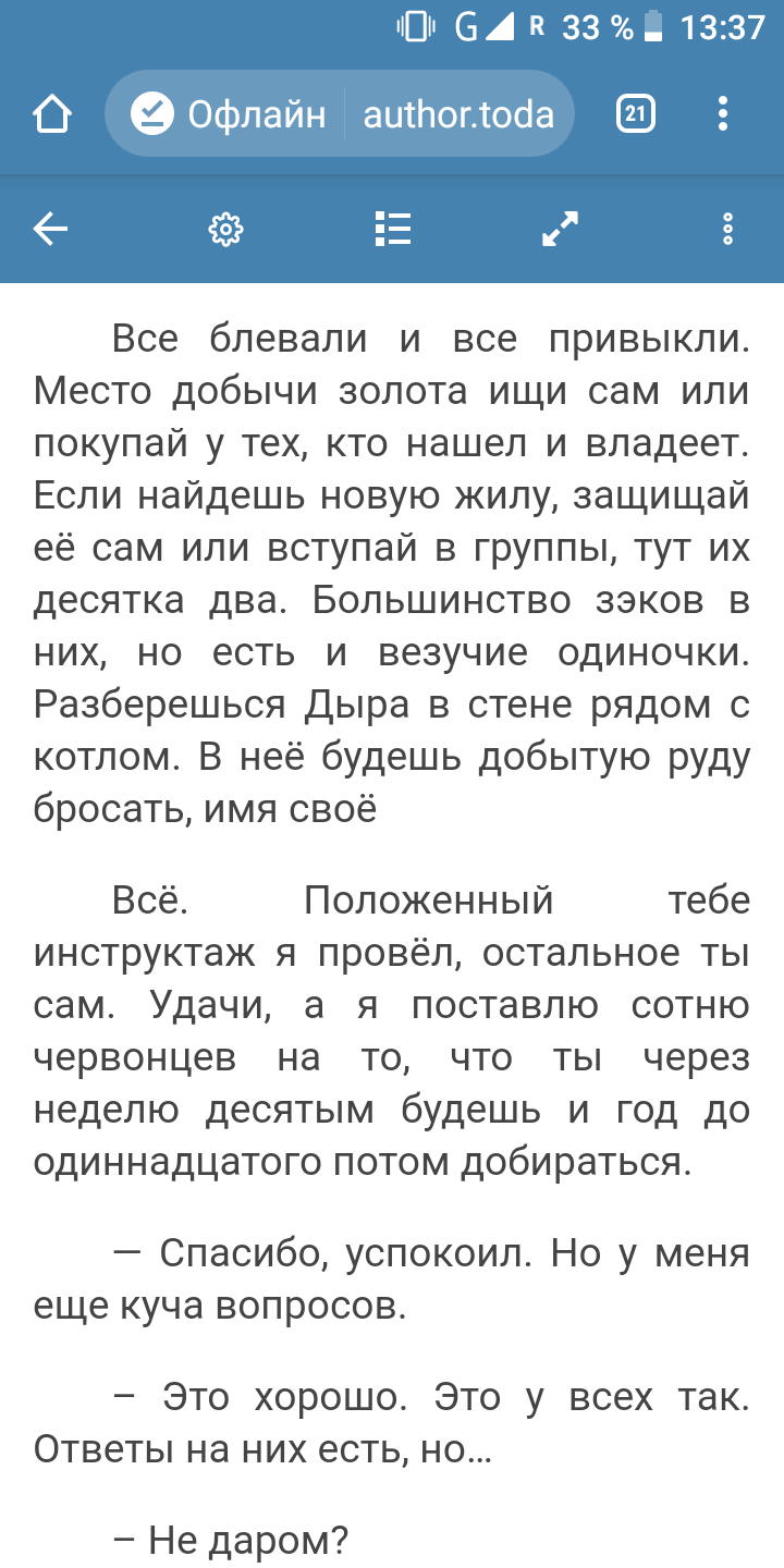 4 дня? Это они по строчке в час читают? Мне на день не хватает, и это я ещё на работе в перерывах время уделяю. Скорее бы можно было купить полную версию и спокойно прочесть)