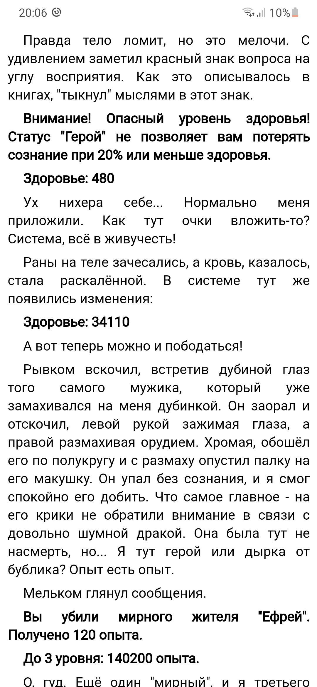 Хотел написать комент про то что не слишком ли легко гг все удаётся, как вообще прошлый владелец тела накопил за всю жизнь всего 300 медиков это же абсурд потому что когда Дмитрий берет тело подконтроль он за 2 дня заработать 15 золотой что хватило ему на несколько лет да и с гг не все в порядке он просто взял и спокойно убил 2 мужиков и даже не испытывал никаких угрызений совести это как минимум странно для бывшего задрота