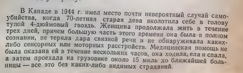 Совершенно верно. Когда-то мне в руки попала книга криминалистике, перевод с немецкого и изданная в СССР. Там приводился случай, когда дама решила покончить с собой и вбила себе в голову гвоздь длиной 10 см. Затем села за руль автомобиля, поехала изрядное расстояние и лишь после этого скончалась.
