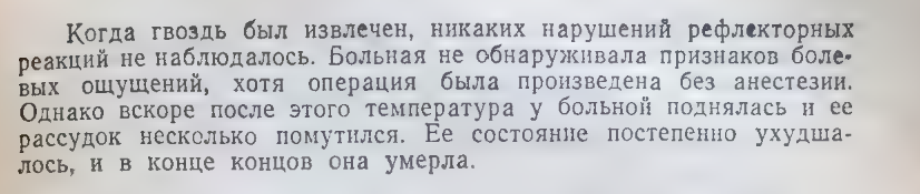 "Черепно-мозговые травмы вообще штука непредсказуемая. Федышинский как-то говорил, что был в его практике случай, когда мужик, которого рубанули топором по голове (вдавленное повреждение теменной кости с обильным кровоизлиянием), отправился в кабак, просидел там около часа, а потом пошел к доктору, у которого прямо во время приема и умер".