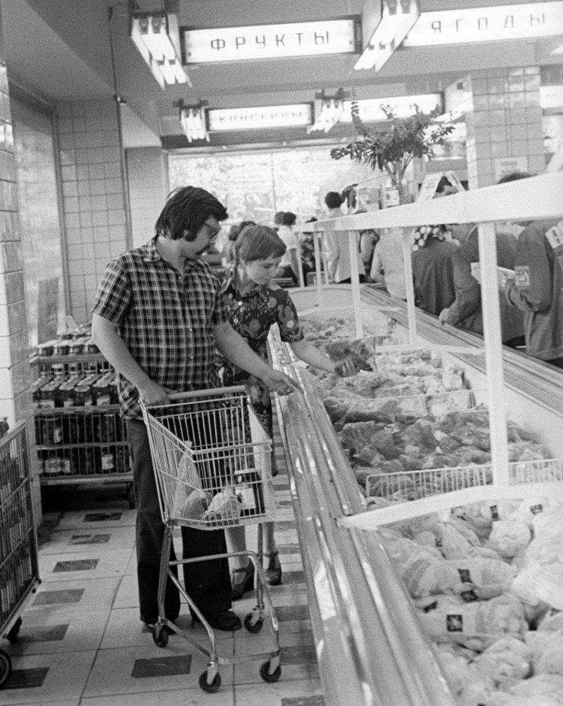 "Универсальные супермаркеты" в те времена так и назывались "Универсам". Появились примерно в начале 70-ых. Формат был точно такой же, как и сейчас - с тележкой ходишь по магазину, а на выходе несколько касс рядком.