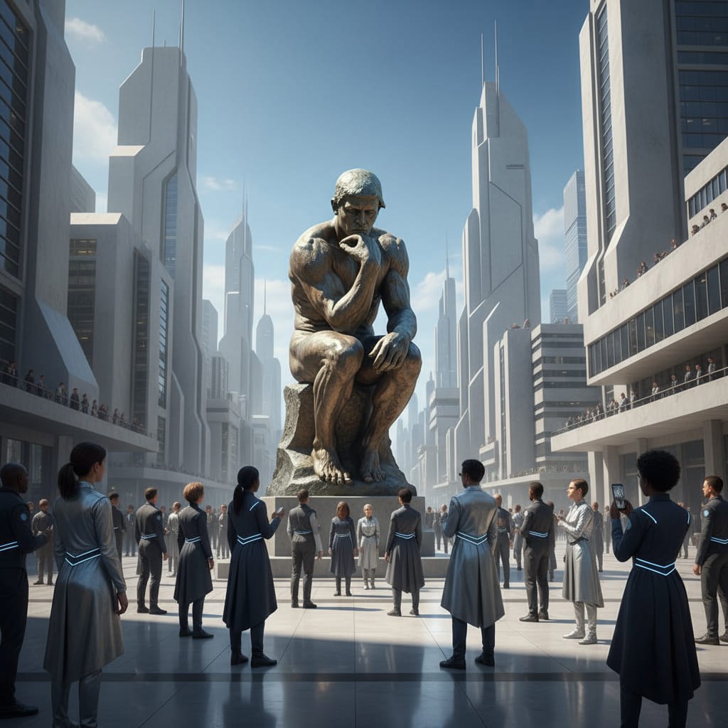 «Я — сама Плоть Раздумья, отлитая в бронзе». Он родился в грохоте литейного цеха, а обрёл голос в тишине сада. Он впитывал шепоты влюблённых, смех детей, симфонии дождя. Он чувствовал, как мир за окном медленно теряет метафоры, краски и смыслы, пока не стал смотрителем музея под открытым небом, где главный экспонат — само Время. А потом Время остановилось. Этот рассказ — последний, тихий монолог вечности, застывшей в позе скорбного раздумья над пеплом былого. Это гипнотическое погружение в меланхолию конца, где нет катастроф, есть лишь тишина, пыль и одинокий ветер, перелистывающий страницы умершей истории.