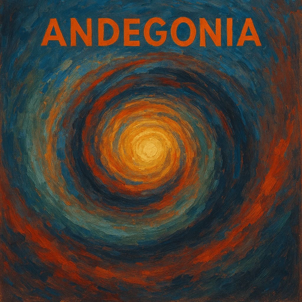 «Андегония» — абстрактный образ внутреннего мира Земли как живого организма. Картина передаёт идею Эндогаии: движение энергии, рождение смысла и присутствие Божественного центра, из которого исходит свет и гармония. Вращающиеся слои символизируют связь материи, сознания и духа — то место, где мир начинает осознавать себя.»